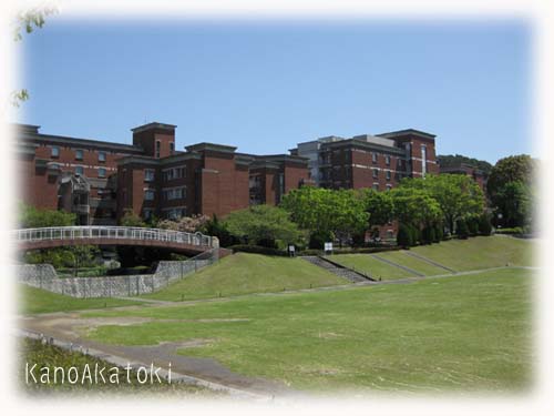 緩やかな下り坂をすすむと、左側に図書館、右側には県立大学になります。