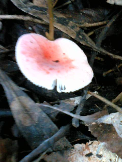 右側のはうすっぺらいキノコなんだけど、朱の色がきれいだったので撮りました。